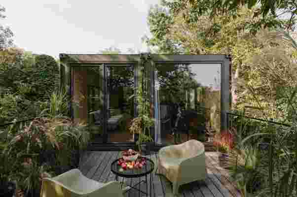 Brightening the home even further, two sets of floor-to-ceiling windows bookend both sides of the Portable Cabin. Cradled beneath tree canopies and besides growing ferns, a spacious exterior deck merges with one set of french doors and the main bedroom’s floor-to-ceiling window.